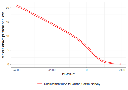 While shoredate and the method underlying it has been developed for application in a constrained region of south-eastern Norway, it is possible to apply it to other areas. The following presents an example from Ørland in Trøndelag, Central Norway, for which a new displacement curve for the later parts of the Holocene has recently been published (Romundset and Lakeman 2019). Furthermore, all that is needed to use the main functions of the package is a shoreline displacement curve that describes the sea-level change at the location of a site to be dated, and an elevation value for that site. Consequently, it is in principle possible to extend the main functionality of the package to any region of the world in which the method is applicable, provided reliable data in a suitable format is available.